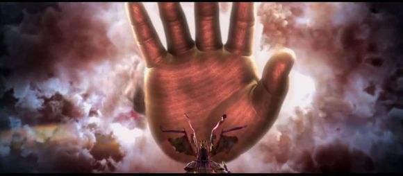 周星驰设计的“如来神掌”其实很简单,就是一只大手从天而降,中间伴随大火燃烧的噼啪之声,然后四周有人念佛,既恐怖,又庄严;既刺激,又肃穆。