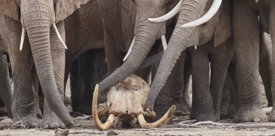 甚至路上遇到已经成为白骨的同类,也会进行类似“葬礼”,挨个用象鼻抚摸白骨,集体吊唁。