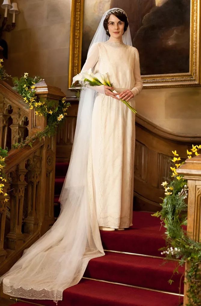 服装设计师caroline mccall为饰演大小姐lady mary crawley的米歇尔·道克瑞的新娘装扮,特意设计了长袖蕾丝礼服,还搭配上镶嵌有30克拉的bentley & skinner钻石、价值20万美元的头饰。