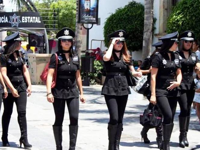 一队年轻、漂亮的墨西哥女警,身穿黑色的制服上衣、黑色的紧身裤、黑色的皮靴,看上去非常的妩媚,但是又显得很威武。墨西哥招募漂亮女警的初衷,其实是改善游客对城市的印象,毕竟这些女警看起来美极了,的确能够代表一个城市的形象。
