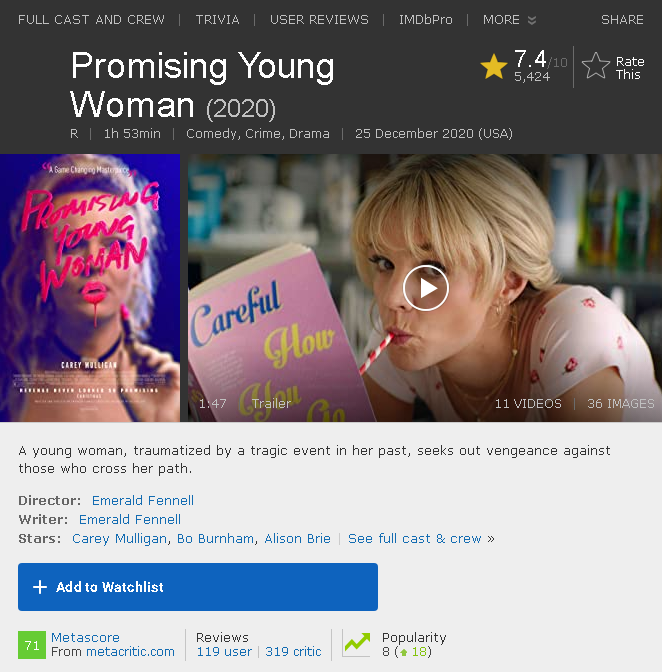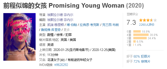 近期大热的影片,《前程似锦的女孩》(promising young woman)就以此为内核讲述了一个有关女性复仇的故事。