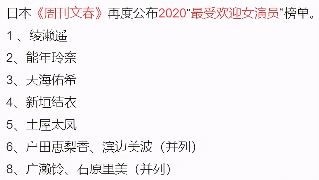 就在去年《周刊文春》公布的“2020最受欢迎女演员”榜单中,她还力压新垣结衣、石原里美等知名“老婆”,夺得冠军,好感度万年c位。