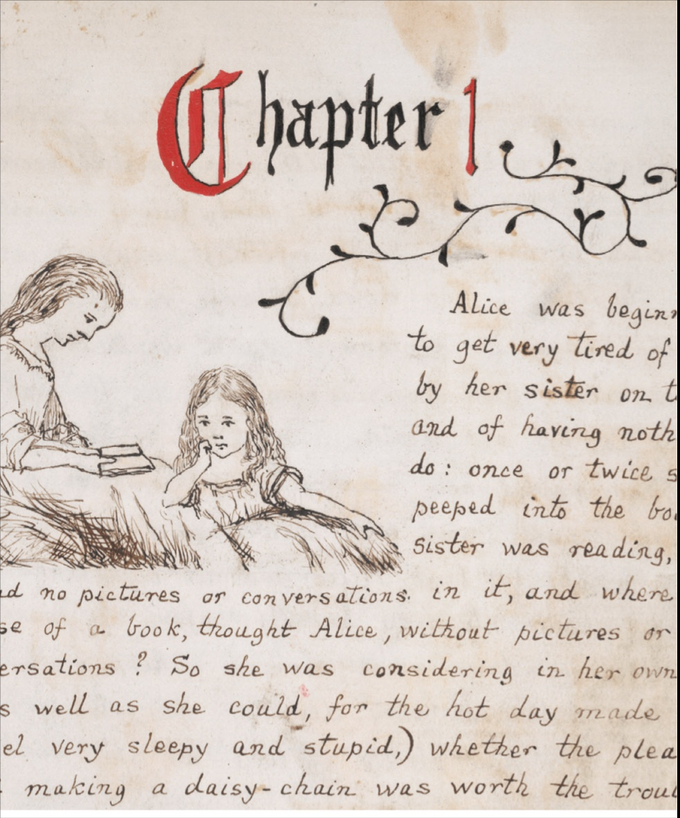 这是《爱丽丝梦游仙境》的作者手稿。你可以看到,这是第一章的开篇和插图,爱丽丝坐在姐姐旁边的河岸上,她开始感到厌倦了。