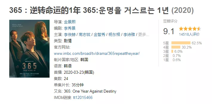 而韩版的《365:逆转命运的1年》剧集已经完结,但豆瓣评分不跌反增,已经达到了9.1了(我也是看到评分高才点进去看的嘻嘻~)