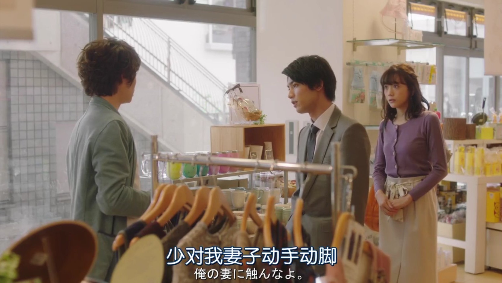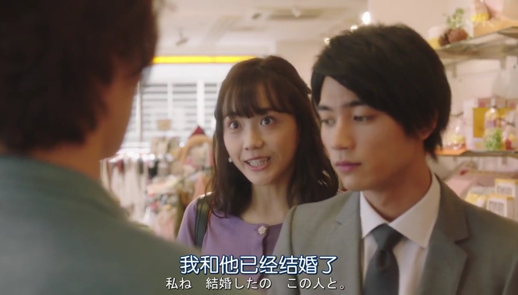女主在商店遇见前男友时,男主突然出现为女主解围,并警告前男友不要再接近自己的妻子,给女主留下了满满的安全感,然后女主也立即上前挽住男主的手臂说“对,我们已经结婚了。”男主有些震惊的看着妻子。前男友只好尴尬的说了句“恭喜”,匆匆离开了。