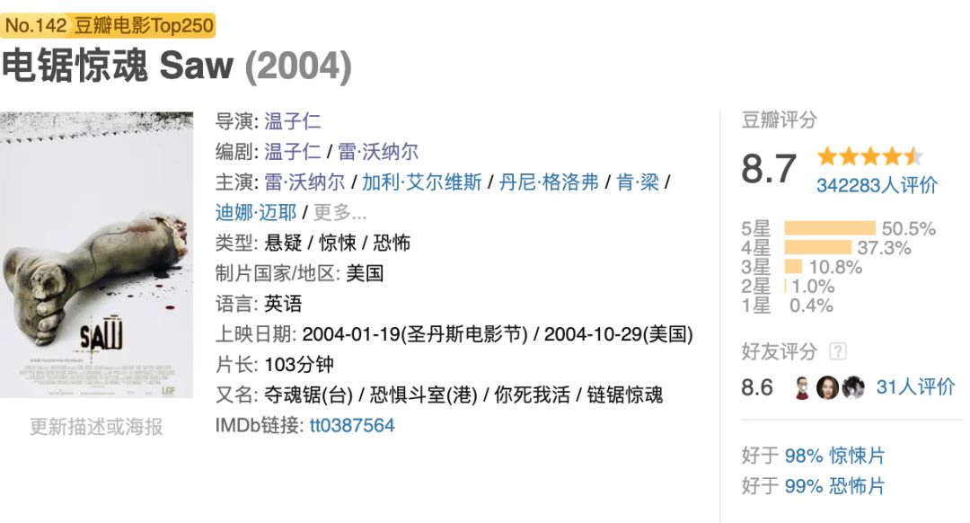 温子仁执导、雷·沃纳尔参与编剧的《电锯惊魂》评分8.7。
