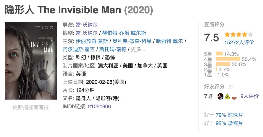 因此,恐怖片想要获得高口碑,甚至在影史留名,最难突破的点便是切中整个时代的集体恐惧,显然,这部《隐形人》做到了。
