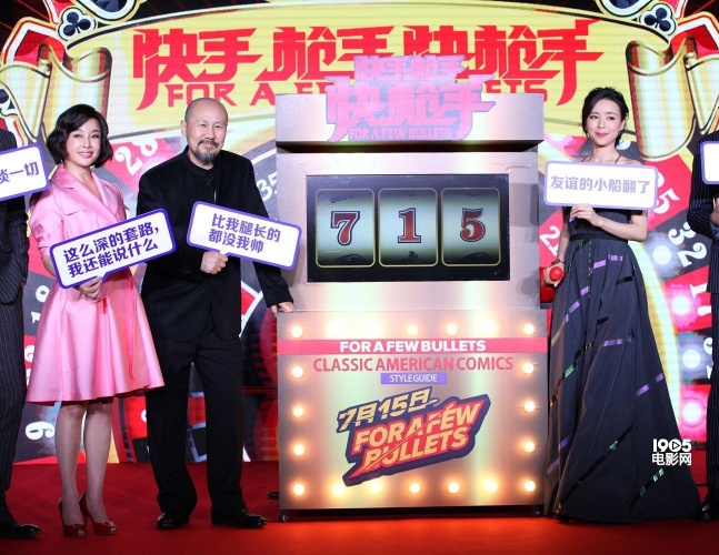 电影《快枪手》原名《火烧云》,讲述了1941年《中日基本关系条约》签订后,国内动荡,许多爱国人士为此愤恨难当,为了民族尊严而寻找传国玉玺的故事。影片的故事缘起于一个“赌”字,发布会现场也布置成了赌场模样,“天下第一快手”林更新、“冷艳第一枪手”张静初、“傲娇第一萌侠”腾格尔、“娇媚第一夜叉”刘晓庆、“江湖第一诡才”锦荣依次出场,介绍了自己在片中的角色。