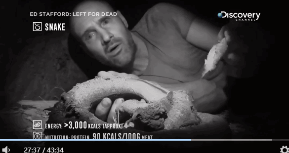 德爷需要通过生火,将有细菌和寄生虫的蛇肉弄熟。