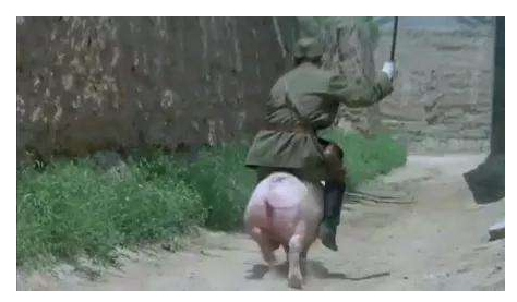 说完了喜剧片的特点,回过头了再看《举起手来》,它的影片内容真实吗? 当然不真实,当年日军怎么可能会为了一件文物如此大动干戈? 这部电影从一开始就奠定了荒诞的味道,随着情节的展开,鬼子趴地排雷靠嘴吹、青蛙肚中的鸣叫、日军聚餐吃猪饲料等等等等片段,全都是导演有意为之,通过对情节的夸张和失真处理产生“笑”果,引起观众的笑声,更别提到后来驴子撒尿浇灭了炸药引线、鬼子军官骑猪飞奔这种直接而显著的喜剧情节。相对于真实生活来说,这片段几乎不可能发生,但在电影中,这些矛盾内容被前后串联在一起,形成了一部荒诞不羁的《举起手来》。