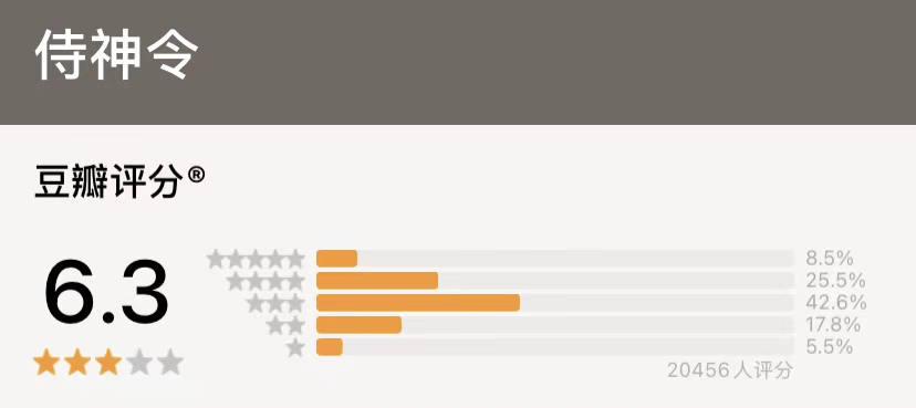 但《侍神令》播出后,却扑得彻彻底底,豆瓣评分低至6.3分,一星占比5.5%,二星占比17.8%,三星占比42.6%,并且感觉评分还会下降。