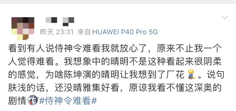 打开微博一搜索《侍神令》,后面紧跟着的词就是“难看”,网友们的评价也是清一色的差评,有网友直言:“《侍神令》是个啥玩意,白瞎了陈坤周迅的演技。”