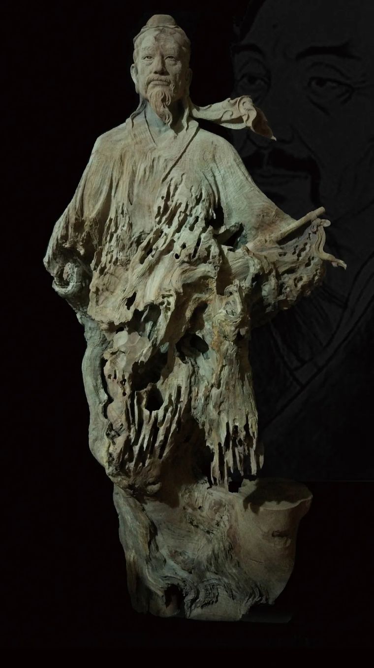 《庄子·天下篇》中记录了墨子的大众形象:“使后世之墨者多以裘褐为衣,以跂蹻为服,日夜不休,以自苦为极,曰:不能如此,非禹之道也,不足谓墨。”穿粗陋的衣服,套上草鞋,勤恳工作,便是墨家人,这也是此尊《墨子》木雕为何会衣着褴褛的原因。木纹的沟壑正好是衣服残破的琐碎,脸上清冷的表情,彰显内心的坚定和执著。起风了,头巾和衣袂飘起,消瘦的身姿如如不动,站立在此,即将开启下一场的奔走。班固在《答宾戏》中说:“孔席不暖,墨突不黔”,墨子和孔子一样为天下事终日操劳,连将席子坐暖和把炉灶的烟囱染黑的功夫都没有,他一生都在为扶危济困而奔走呼告,是历史上第一个农民出身的大家。