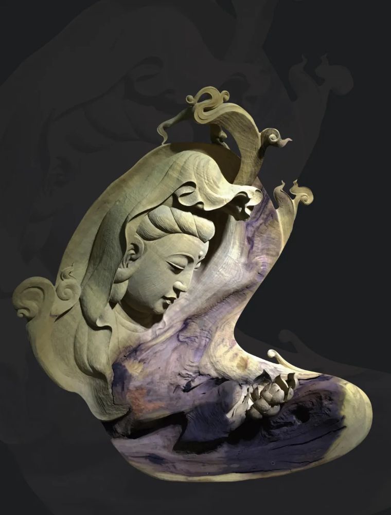 该作品撷取了头部像,半侧脸的观音低头看向莲花,莲花或许是开在池塘里,或许只是偶遇的一朵,不论它从何处来,也不论此后它会飘向何处,当你与它相视的这一瞬,静气凝望,慈悲心生。这件木料的可贵之处在于它具有罕见的紫色纹路,从色感上,有“紫气东来”之韵味。为花着色后,这雕塑中的莲许是紫色睡莲,它被视为圣洁、美丽的化身,是吉祥之花,备受人们的喜爱。木料的色彩为作品增添了不少光彩,也正因此,作者才会着手创作这一具有宗教性质的题材作品。整件作品的外轮廓呈椭圆形,睡莲下的圆有些类似荷叶的形状,这样一件装饰性很强的作品,在形与色上都十分适合在公众场合里展示,给人一刻清凉的感受。