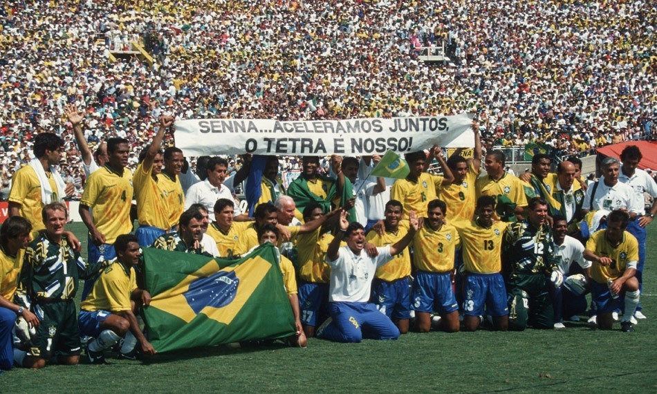 ▲巴西足球夺冠后,高举写有“塞纳和我们在一起夺冠”的横幅
