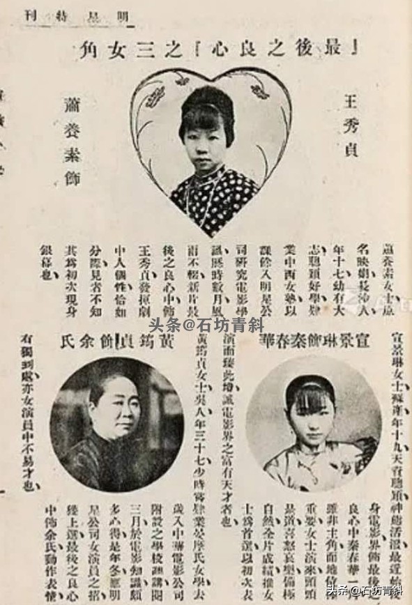 1925年明星《最后之良心》特刊内页,萧养素(上) 、黄筠贞(左下) 、 宣景琳(右下)