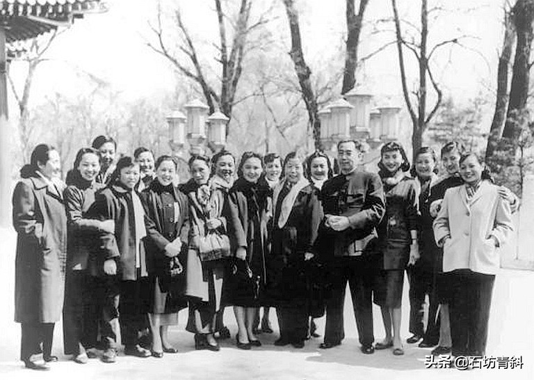 1957年,周恩来在中南海会见电影界的女演员后在紫光阁前合影。右起:王人美、黄宗英、岳慎、夏梦、周恩来、黎莉莉、邓颖超、舒绣文、白杨、吴茵、宣景琳、上官云珠、石联星、于兰、胡朋等
