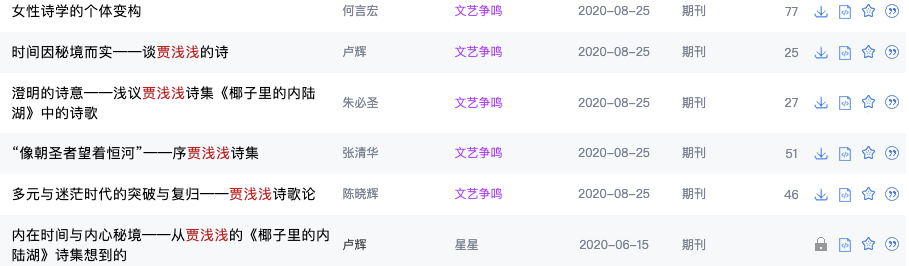 与网友群嘲形成鲜明对比的是学术圈的认可和称赞。2020年8月,cssci期刊《文艺争鸣》上发表了5篇对贾浅浅诗歌评论的文章,北京师范大学文学院教授张清华、上海交通大学教授何言宏、西北大学副教授陈晓辉等人从不同角度谈了贾浅浅的诗歌。三明市广播电视台的卢辉以“秘境”为主题,发表了两篇评论性文章。