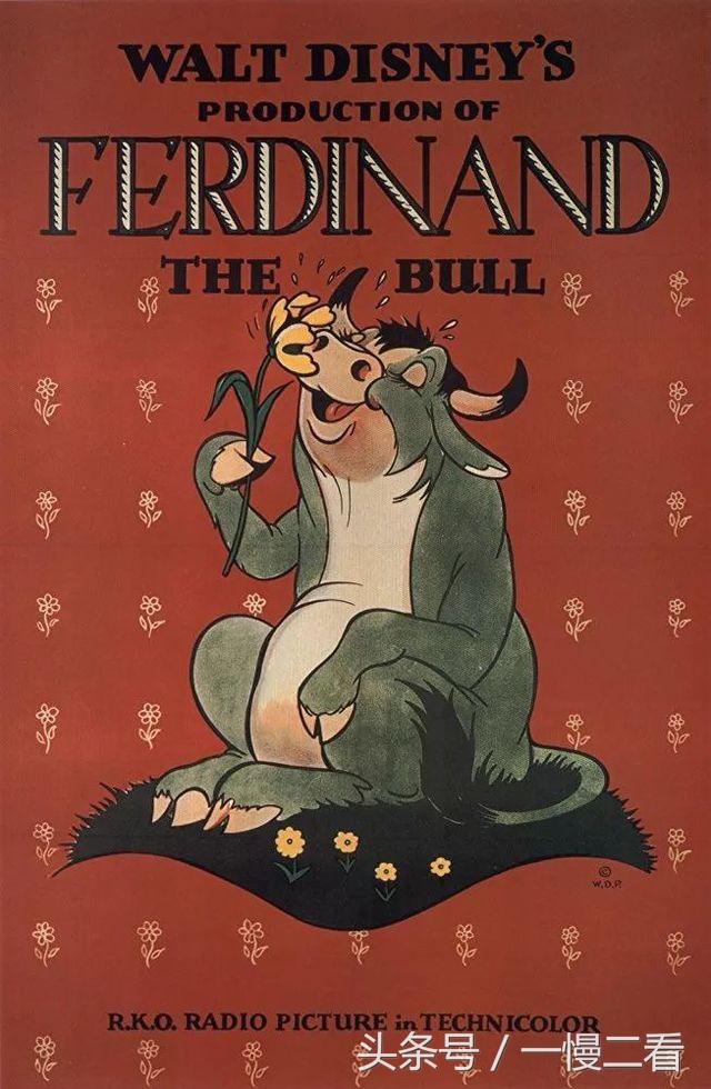 迪士尼动画版的图书版迪士尼的嗅觉也是灵敏,说服了两位作者授权他来拍摄成了动画片。1938年基本上按照故事内容制作成了8分钟的动画短片,重点塑造了公牛费迪南可爱、温柔、平和的形象。迪斯尼公司在出品这部电影时夹带了不少“私活”:不少斗牛士的形象都是照着自家动画师画的。影片里还出现了白雪公主,她“饰演”了一个打酱油的角色。有一幕,是她给一个斗牛士扔鲜花。而那位斗牛士正是迪士尼。在那个时代下,这部被赋予多重含义的动画短片获得1939年的奥斯卡最佳动画短片奖。