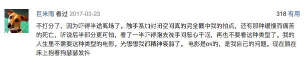 电影里密室逃脱和未知高等生物的设定圈了一波粉儿,截杀外星人和被外星人截杀成了全片的看点,有观众看到一半中途离场,理由:太吓人了。