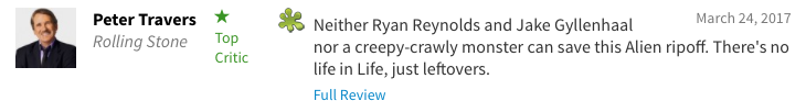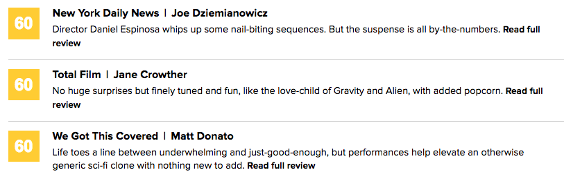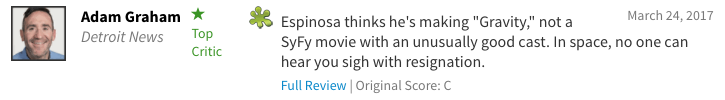 《底特律新闻》影评人觉得丹尼尔·伊斯皮诺萨觉得导演在营造《地心引力》,但是选错了卡司;《滚石》杂志的影评人也是木有客气,直接说不管里面谁演的,多牛逼的怪物,都挽救不了你抄袭《异形》的事实,在电影里没有新鲜的,都是吃剩的。