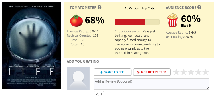 早在美利坚上映过的《异星觉醒》已经收获了一波评分,imdb上4万人评分6.9,烂番茄新鲜度68%,爆米花指数60%,但星级评委新鲜度给出了46%,显然这是不及格的。国内电影网站只有豆瓣出了评分,3774人打分7.1。