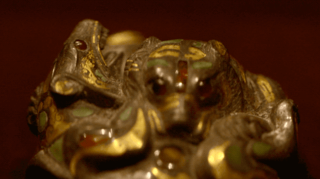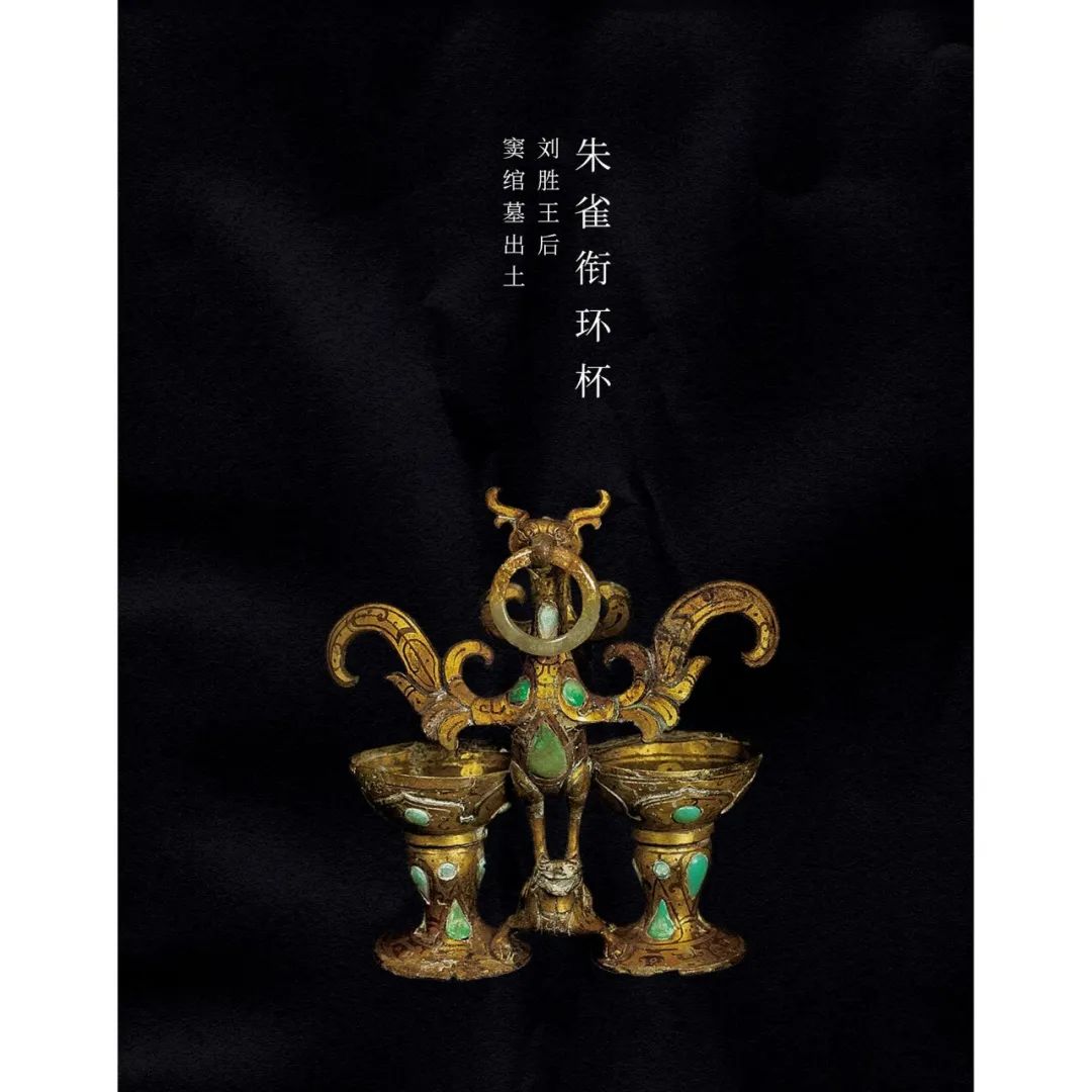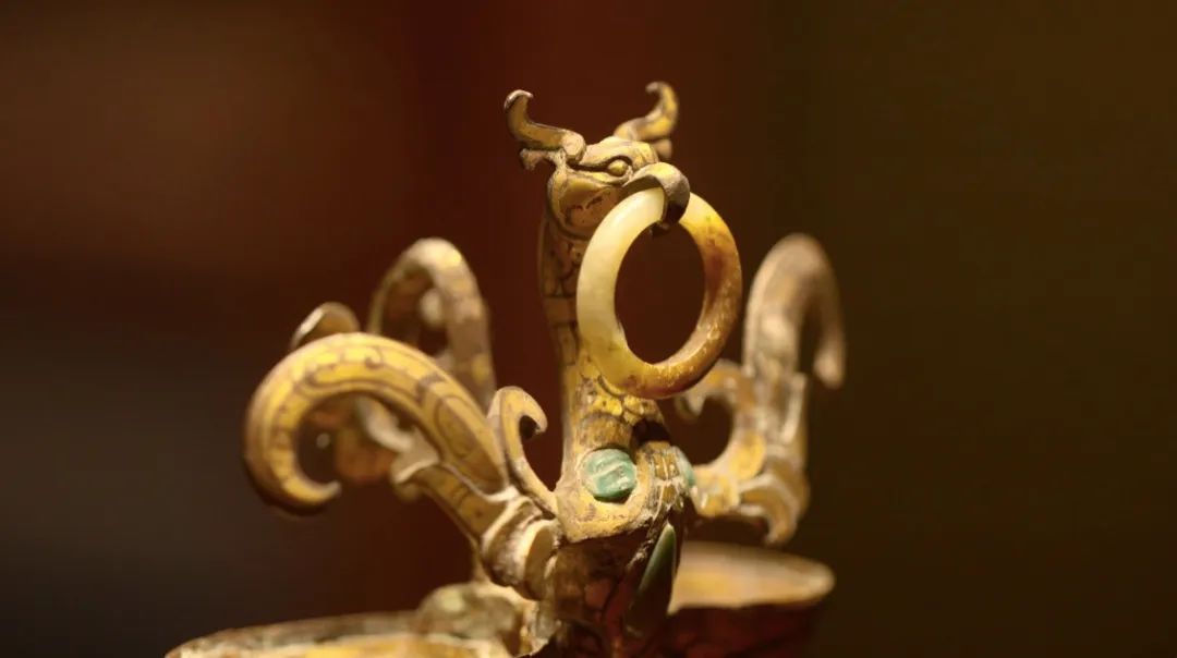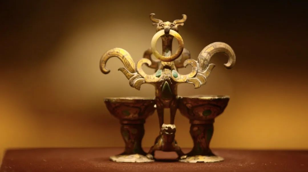 这件文物的整个造型非常独特,中间是朱雀,衔着一枚可以自由转动的玉环,挺立在一只小神兽的背上,而这个匍匐神兽的双足又紧扣住两个高脚杯。朱雀的颈部和腹部,两个高脚杯的杯身上镶嵌有10来颗绿松石。