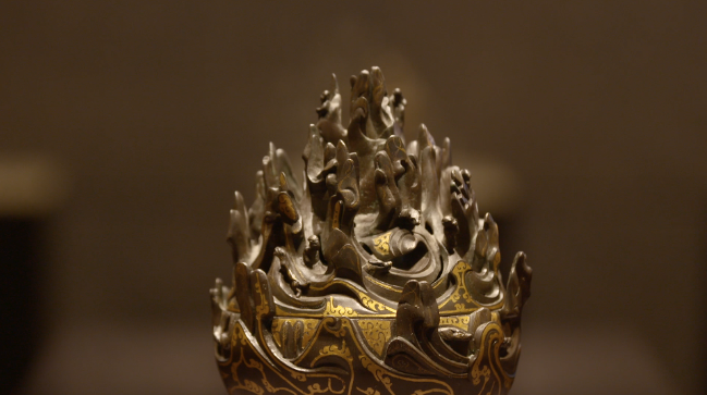 博山炉是西汉时期贵族们中间非常流行的一种熏香器皿。这座博山炉分炉盖、炉盘、底座三个部分,炉盖可以打开,里面放置熏香。