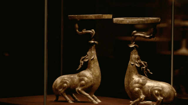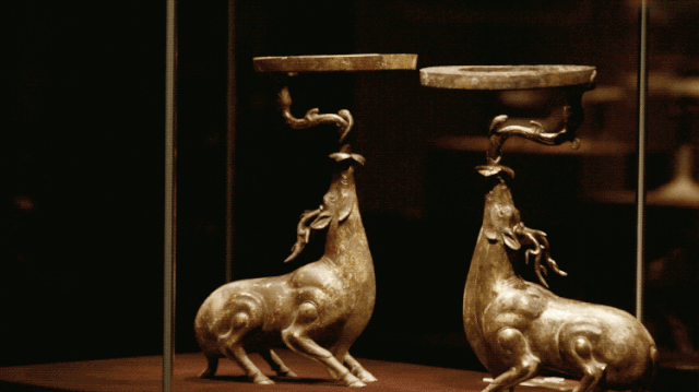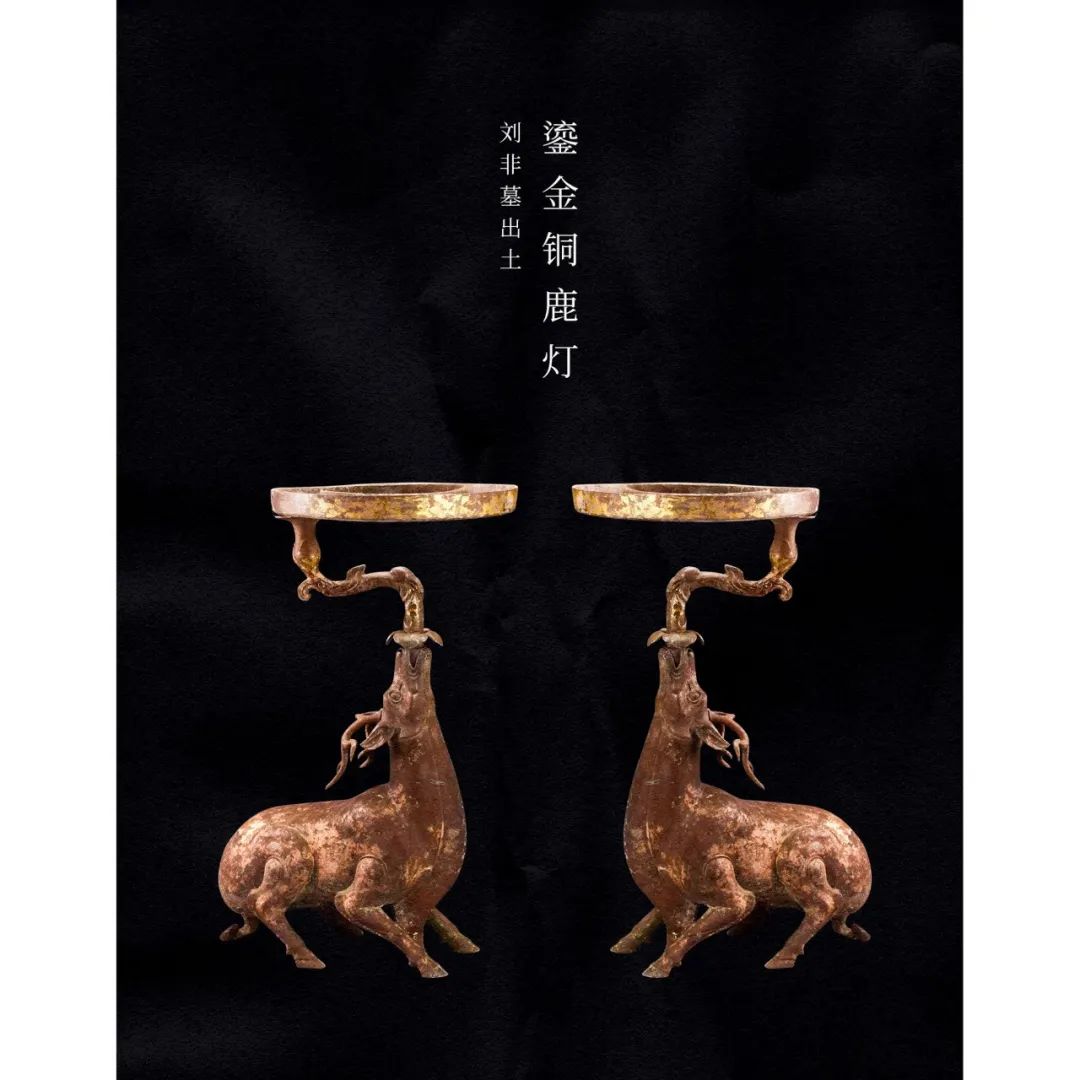 这是目前汉代考古发现中,唯一一组以麋鹿为造型的灯具。通体鎏金,自上而下由圆形的灯盘、灵芝仙草形支架、鹿座三者组成,这三部分可以拆解分离。