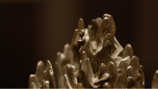 炉盘的上部和炉盖,铸出了山峦叠嶂的效果,仔细看会发现有一些神人、神兽在上面飘荡,代表的是汉代人心目当中的仙界。