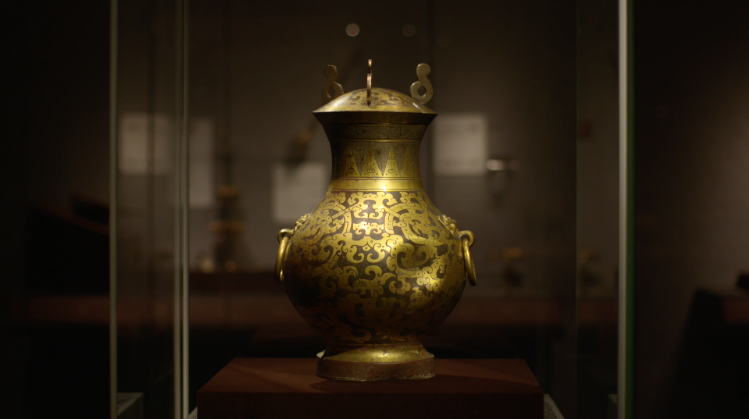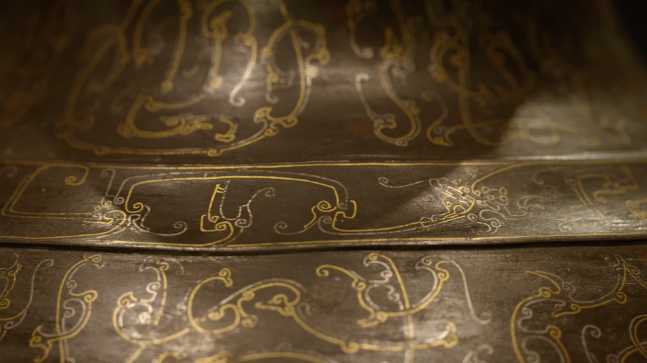 仔细看它的表面,纤细精致的错金丝和银丝互相并联,能够反映出当时高超的金属细工工艺。壶身上还有铭文信息,其中“撎于口味,充润血肤,延寿却病,万年有余”等文字内容,与饮酒、养身文化息息相关。