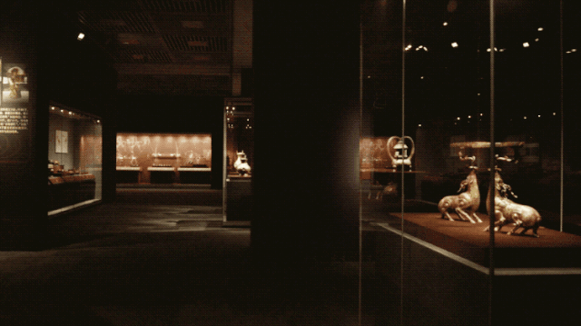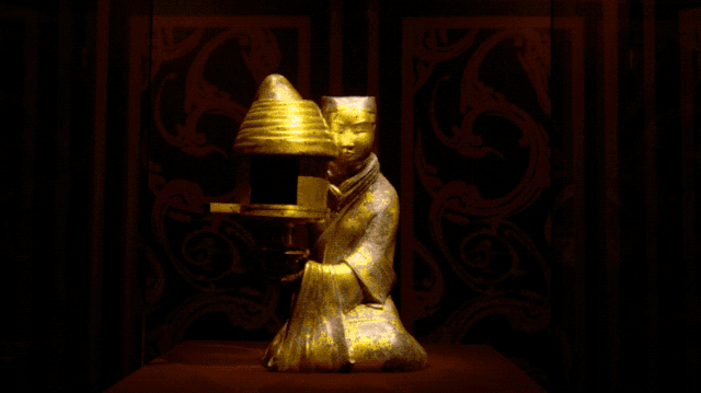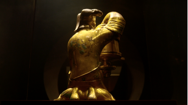 一踏入展厅,就可以看到中心轴线上的一件国宝文物——长信宫灯。整个造型是宫廷侍女的形象,面部表情端庄、安详。用了当时最顶尖的鎏金工艺,通体发亮。因为刻有“长信宫”三个字的铭文,就有了这个名字。
