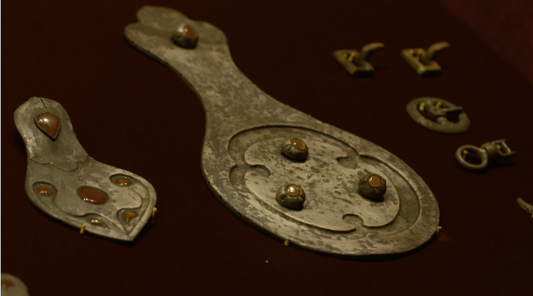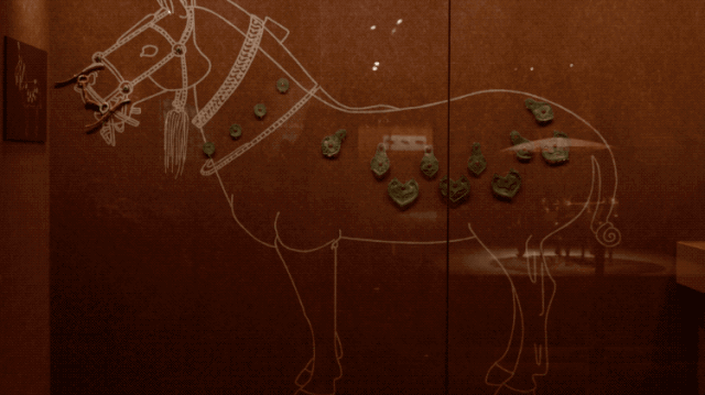刘非墓车马陪葬坑里,留下40多块巴掌大的嵌宝石银质装饰片,根据展览上的复原图,我们可以想象马车出行时,身上挂满了高级的银片,这种规模,不是靠钱多就能拥有,而是要到等级达到最高,才能享受。