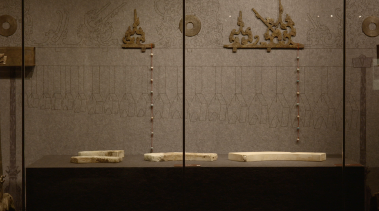 编磬是中国土生土长的大型组合类敲击乐器,比青铜编钟要更早出现。编磬,一般是石质的,声音特别清脆。而像这样成套的琉璃质地的编磬,只有在大云山刘非墓出土过。