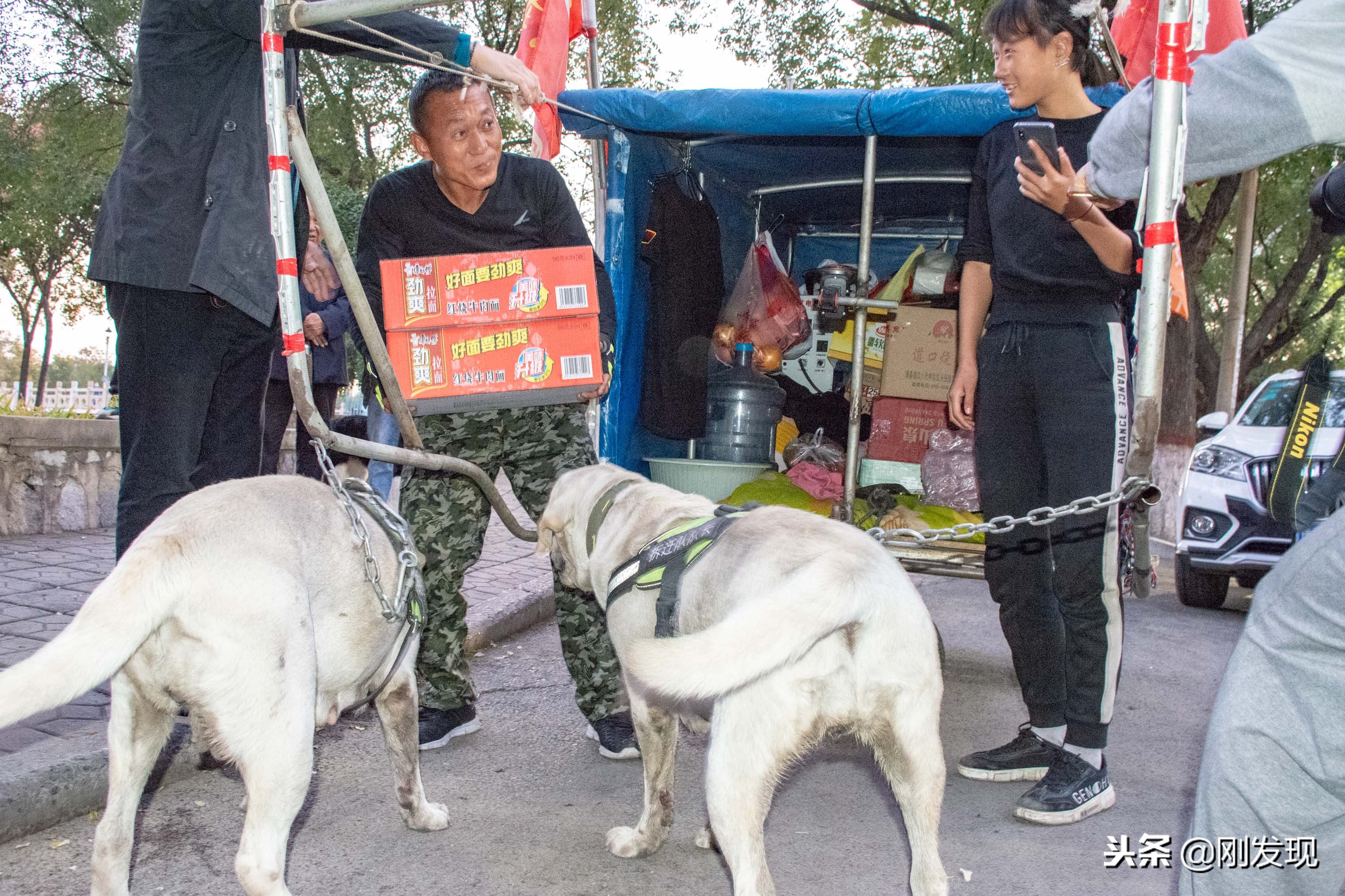 两条布拉多犬虽然不是专业的拉车狗,但已随从主人走过了3000多里地,看到主人收到的礼品,它们心里想晚上又有肉吃了。