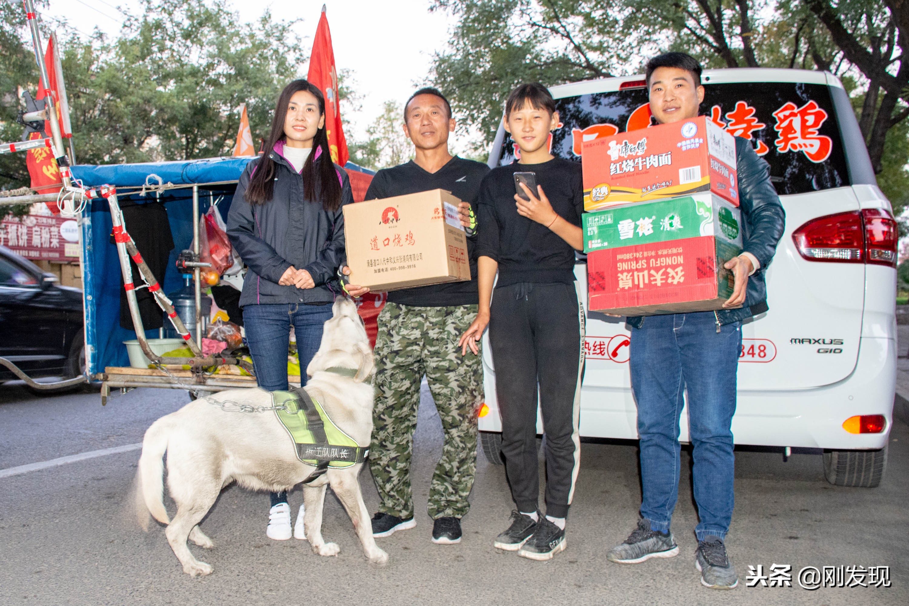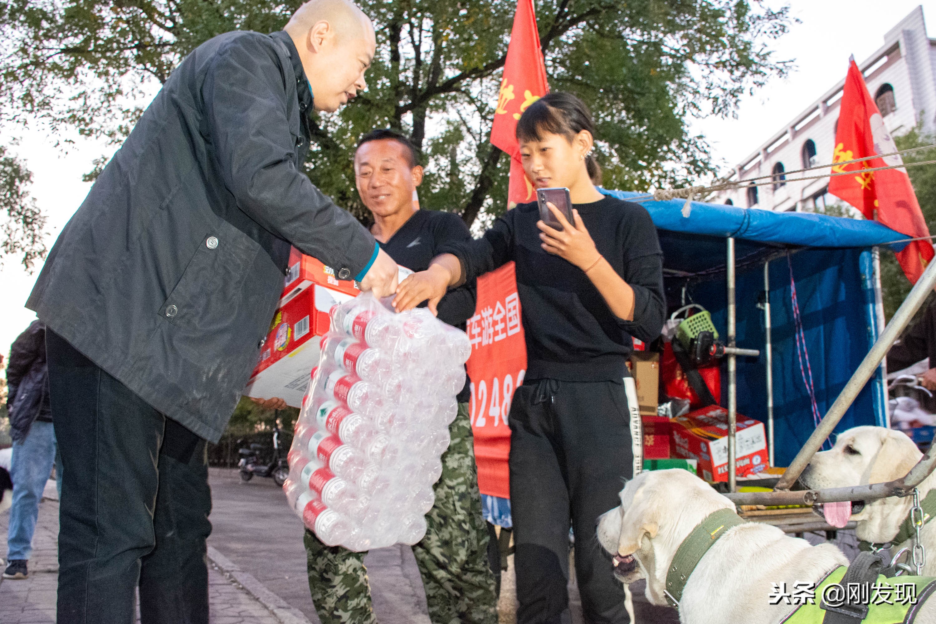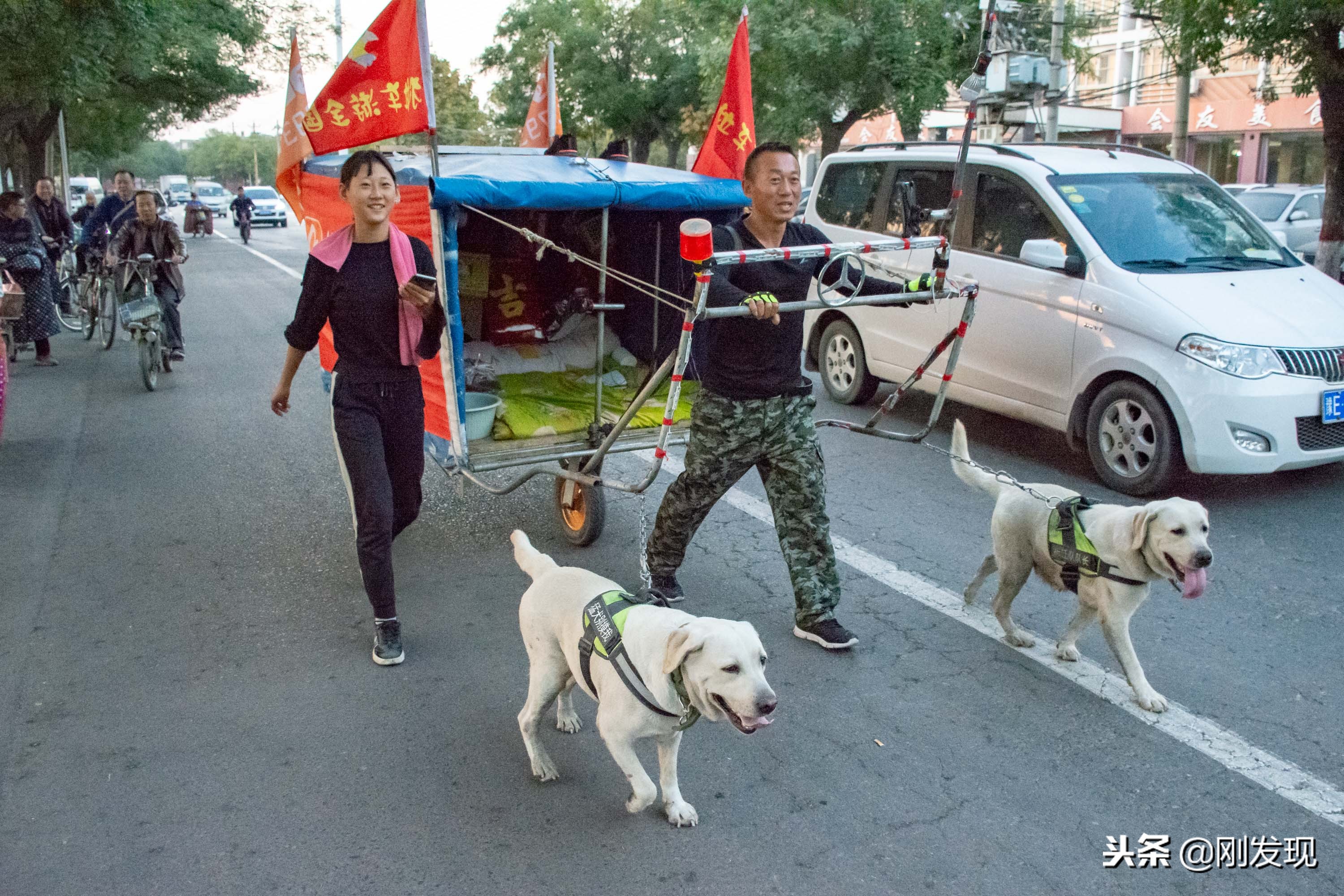 这天太阳将要落山,在纵贯河南南北的107国道新乡市郊路段上,步行和骑车的人们纷纷停下来回头观望一辆插着旗帜的拉车。拉车的人是一中年男子和一名年轻姑娘,中年男子一直对着固定在车把上的手机直播着,他们前面拉车的还有两条布拉多犬。(李刚)