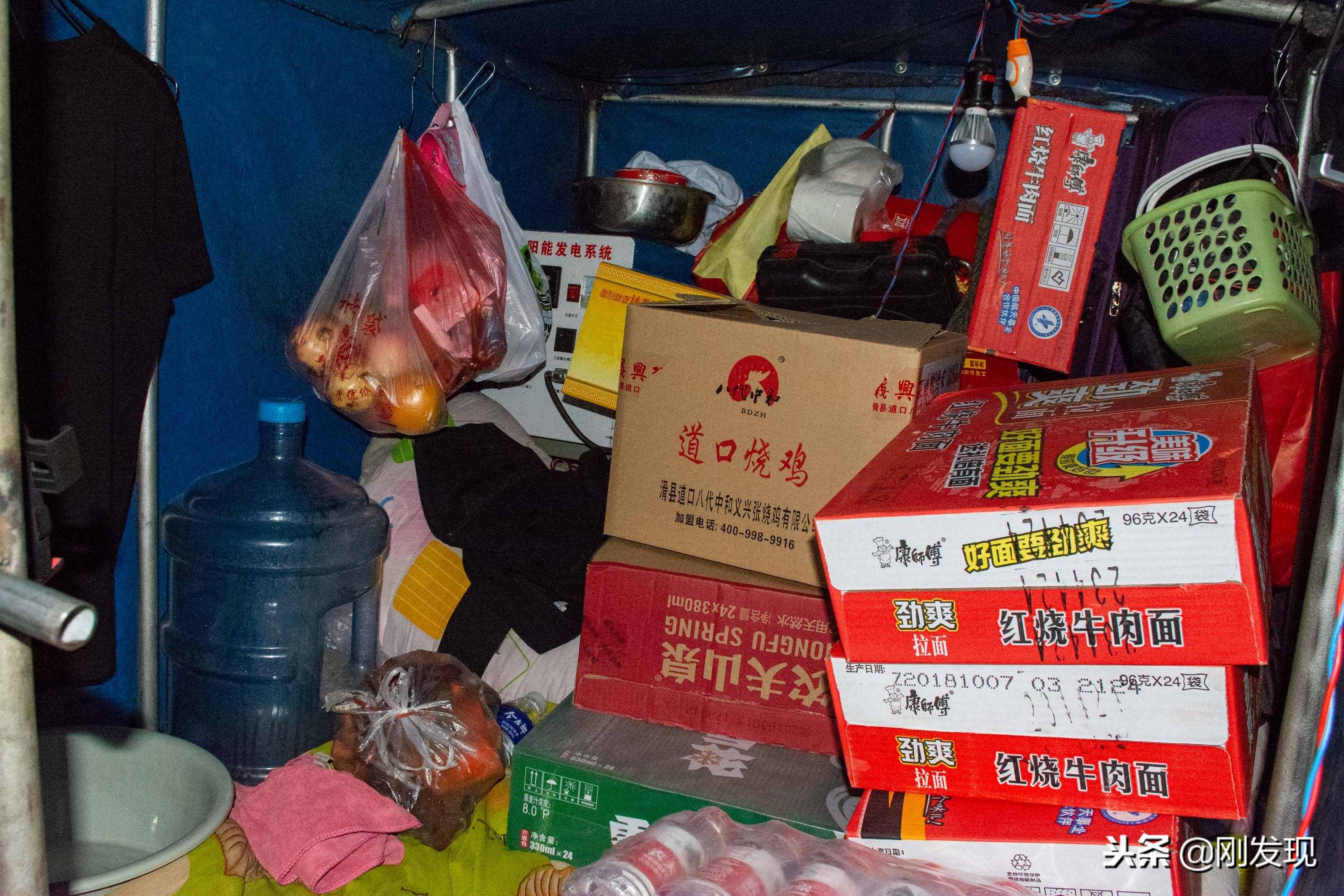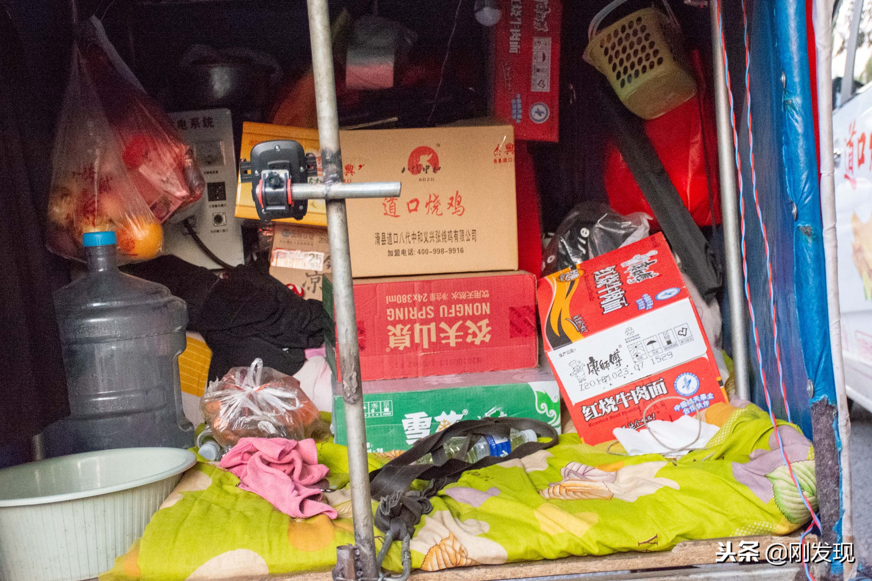 崔明微花五千元改装的车,除了没有卫生间外,其它是卧室、厨房和仓库的组合,每天晚上父女两人就睡到这里面,中间有拉布隔开。他们一路走来,路上好心的人们一直给他们赞助日常用品,车上有半数以上的空间都被礼品占据。