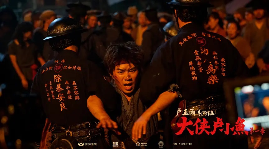 开场剧情推进缓慢,两集半的篇幅,大致就讲了两场戏,一场是卢小鱼被当作杀害父母的凶手即将问斩,另一场是卢小鱼被营救后加入了“夕阳红战队”。本以为接下来的故事会更无趣,谁料精彩的环节才刚刚开始。卢小鱼与甲贺忍者的初次碰面就险象环生,为了脱险俩人临时合作,从“巨型人形烧”到“练习推拿的假人”再到“人形茶宠”,笑点一个接着一个;为了破解丧气屏障,卢小鱼伪装成走失多年的丈夫,面对着“女版沙悟净”要求同床共枕的难题,化身成意志坚定的“柳下惠”,用拖延大法创造了奇迹……后面的剧情和故事,完全不可同日而语。种种桥段,不光用料足,更是保持着卢正雨的一贯水准。追剧到此处,笔者才捋清楚“夕阳红战队”真正的打开方式:当观众报以希望时,先抑后扬、低开高走;当观众不抱希望时,惊喜、笑果、笑料一股脑地端上来,真是让人越看越上头。