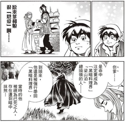 重点两个,其一是刘昴星老爸视为中华美食街最为顶尖的料理人之一,是举世公认的黑暗料理界的统领。其二为,刘昴星老爸遭到了“太极料理界”的追捕,意图让他去驾驭传说八厨具,达成吞噬世界的阴谋计划(太极料理界才是当今世界所有黑暗的根源,黑暗料理界只是其中的一个叛变的小分支组织罢了)。
