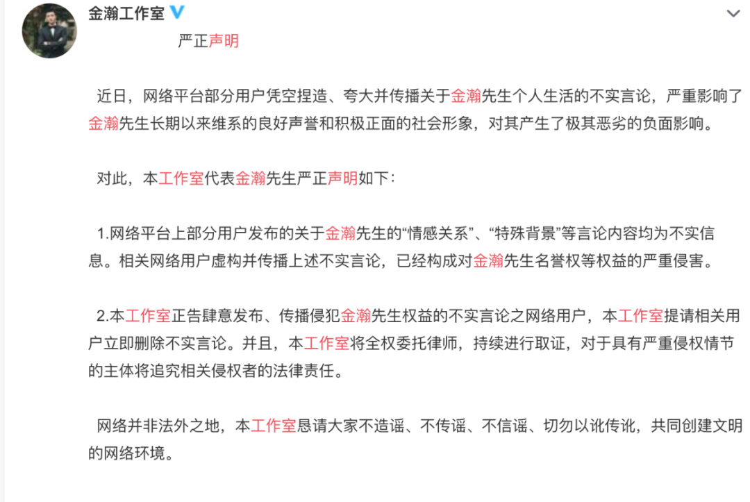之后,金瀚工作室发声明,强调现在网络上的一切言论都不实,男主、女主来了一波双重否认。但吃瓜群众心里怎么想,可不是他们一句否认可以左右的。