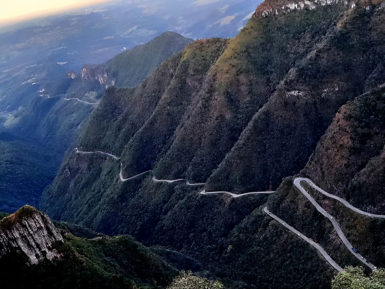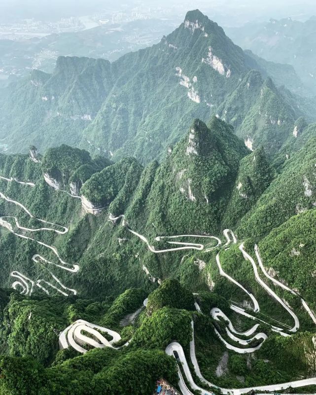 天门山盘山公路位于湖南的天门山国家森林公园内,又被称为“通天大道”。这条路的修建条件异常艰苦,耗时8年才最终完工。在短短的10.77公里中,大道的海拔就从200米攀升到了1300 米。循山势而建的99道弯,恰与国人对终极的追求相契合,被誉为“全国盘山公路之首”。路极狭极险,除特殊比赛以外并不对公众开放。游客可以体验一下世界上最长的高山客运索道——天门山索道。它的斜长有7455米,最大爬坡角为38.6度,单程约28分钟。索道以市中心的城市花园为起点,而后直达山顶。在缆车上鸟瞰整条盘山公路,如巨龙盘踞,蔚为壮观。
