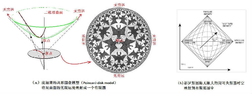 作为一个数学家,彭罗斯的宇宙理论是构建在他建立的数学模型之上的,ccc的数学基础是共形映射,也叫保角变换。“保角”一词反映了变换的几何意义,即保持了两条光滑曲线之间的角度以及无穷小结构的形状不变,但不保持它们的尺寸。如下图所示的两个共形映射,保持曲线间的夹角为直角,因而,图中所示的小矩形在变换后仍然映射成矩形但每个矩形的尺度变化了。