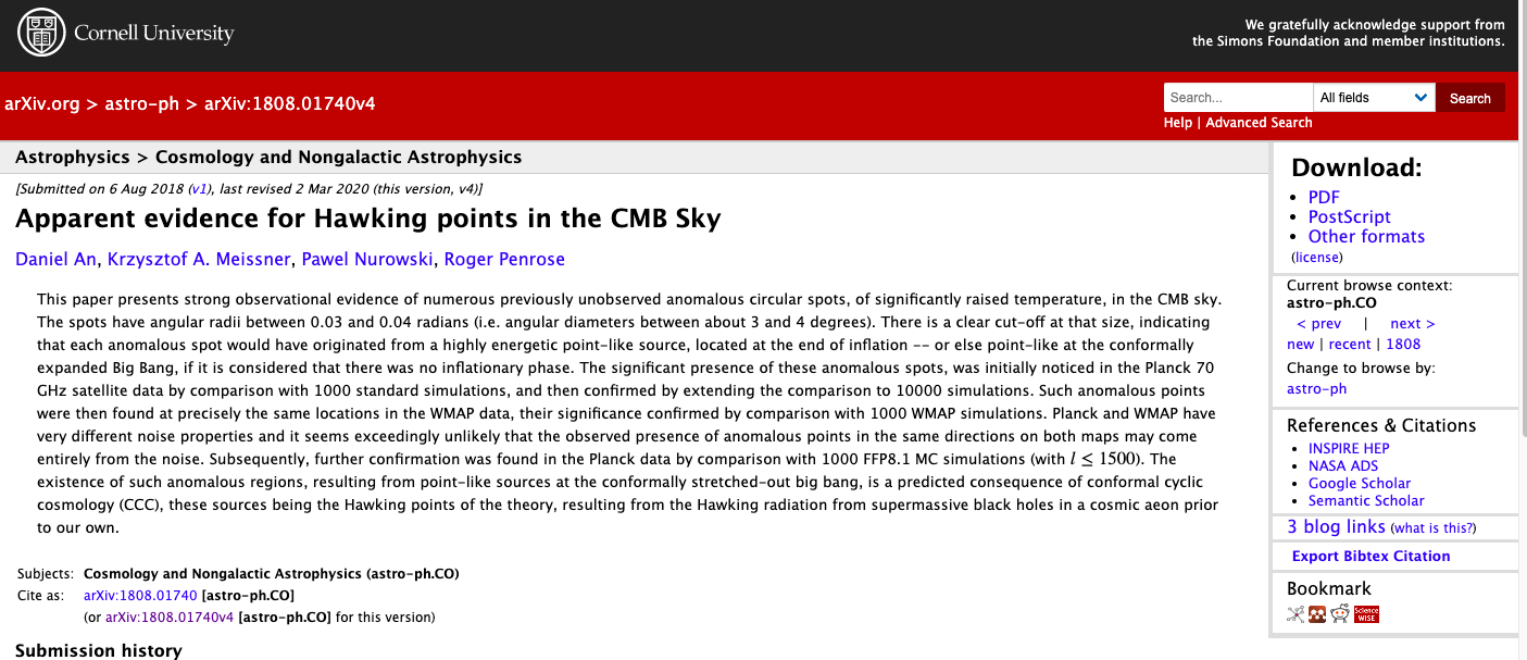 在这篇论文在,彭罗斯表示黑洞会发出被称为霍金辐射的辐射,正是这种辐射可能从一个宇宙传到另一个宇宙。因为这种辐射由于整个黑洞未来的共形压缩而极大地集中,导致一个点在交叉处进入我们当前的宇宙中。而彭罗斯发的这篇论文就是要证明霍金点的确存在,从而证明自己宇宙循环理论的正确性。