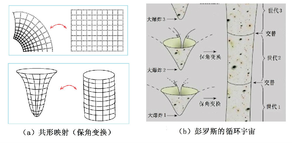 在彭罗斯的ccc理论中,他将宇宙“大爆炸+膨胀”的双曲面(类似)时空结构,映射成貌似柱面的形状。也就是说,在大爆炸的时间点,原来密集缩小的空间被变换拉伸了;而对未来而言,变换可以将无限扩张的空间限制在有限的范围内。彭罗斯进一步设想,这种变换后看起来像“柱面”的时空结构可以一个一个地首尾相连,接成一长串平滑过渡的时空流形,并一直延续下去,从而回答了宇宙从哪里来到哪里去的问题。他在这个理论中,没有否定大爆炸是宇宙的开端。不过如果他的理论能成立,那将会颠覆标准宇宙模型,整个科学家将会真的迎来一场大爆炸!