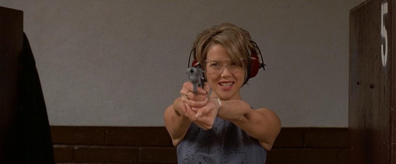 在影片结尾的分角色多视角再现枪声时间节点的现场空间来看,答案是不言而喻的,是弗兰克上校。而影片此前多处出现妻子卡洛琳的射击场景最终却又“假以他手”完成了“精神弑夫”。这种隐喻的含义自然是毫不晦涩的:是病态的精神世界、无形的生活枷锁结束了莱斯特的生命,是在众人的宣泄、愤怒、癫狂中,彼此完成了一种解脱。