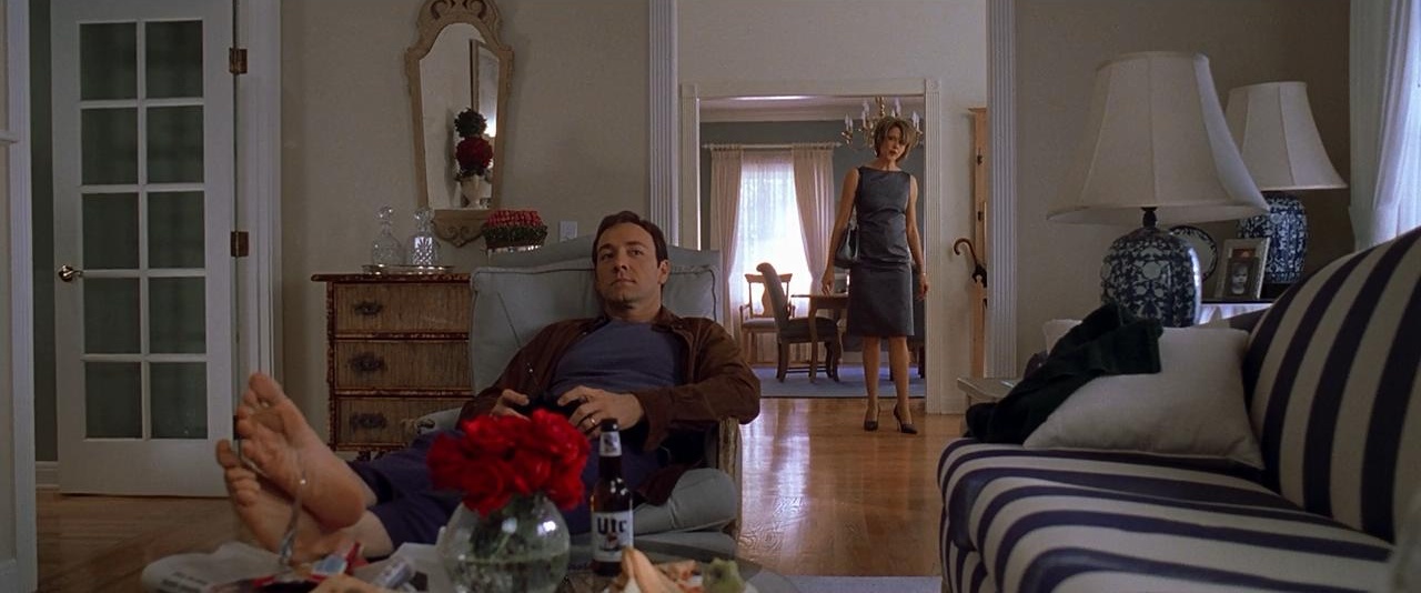 莱斯特(凯文·史派西饰)是一个具有高度典型性的中产阶级中年男性。事业上庸庸碌碌、婚姻生活麻木冷淡、父女关系疏离充满隔阂,因此,他时时刻刻处于妻子的冷暴力、女儿的埋怨中倍感压抑。走样的身材、生活的琐屑、遥不可及的理想,使得他的生命陷入一种病态的平庸不能自拔。