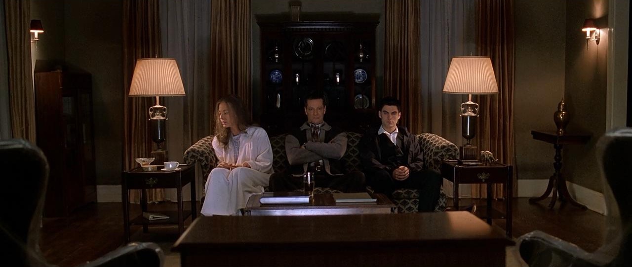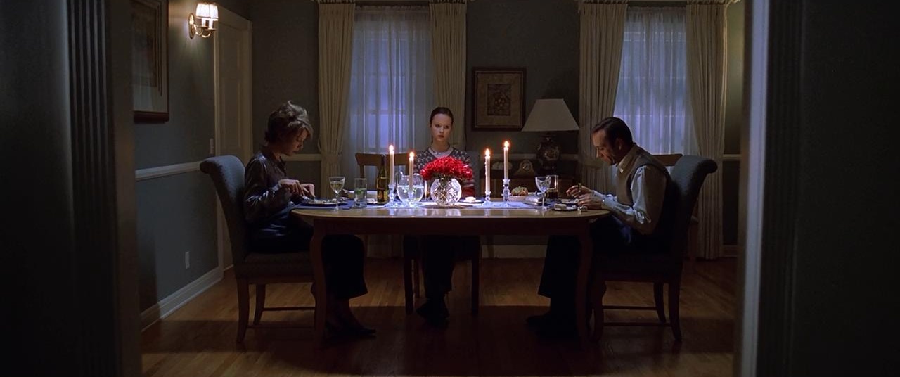 在室内空间的调度上,萨姆·门德斯的舞台调度功力可见一斑。不同层次的光线,冷暖色彩的对比,构图上的关系暗示隐喻,随处可见且张力十足。例如,莱斯特与卡洛琳饭桌上的剑拔弩张,女儿简的无所适从,无不昭示一家子的疏离与隔阂;邻居一家,上校强势占据视觉中心,妻子被挤压到沙发边缘,神色压抑又憋屈,无需台词交代,跋扈的上校,委曲求全的妻子,此般家庭生态便可窥知一二。