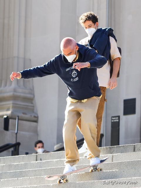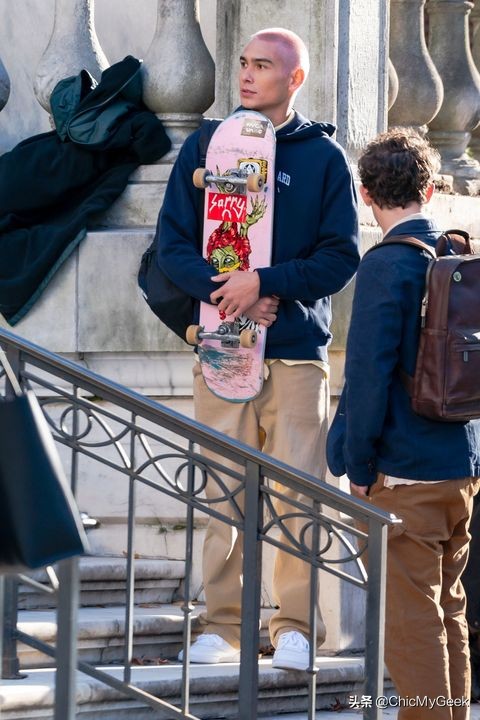 粉红色平头男akeno menzies由模特evan mock饰演,来自夏威夷的evan mock大有来头,除了本来就是一位滑板选手,担任过lv、off white、dior的大秀模特,还担任过travis scott演唱会摄影师。国外lv比较大的店还摆着evan mock的平头外型做的巨大石膏像!