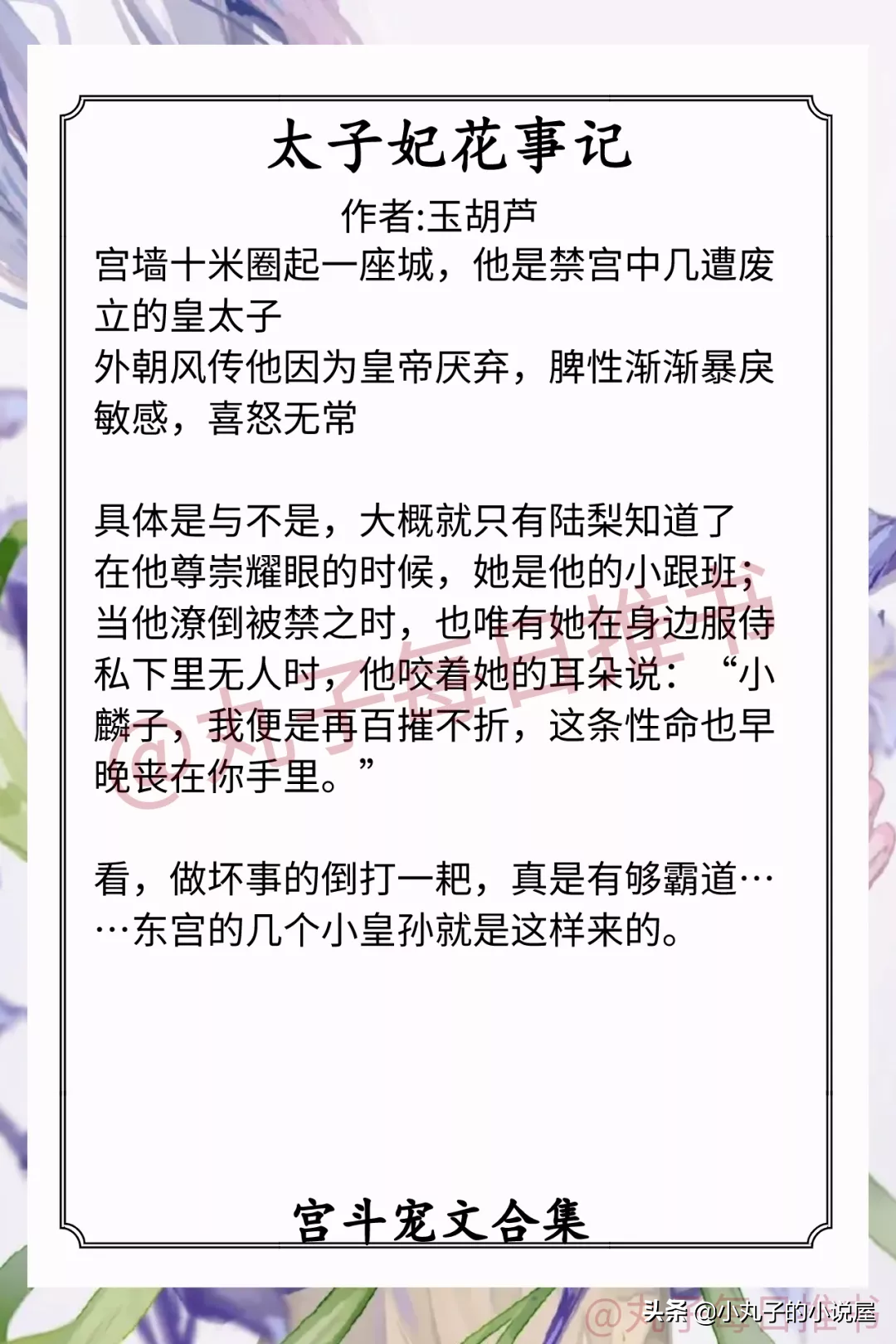 1.《太子妃花事记》 作者:玉胡芦(卑微小太监vs可怜皇太子,女扮男装,青梅竹马,相互扶持,宫斗,权谋斗争)