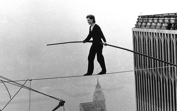 我一脚踏在大厦上,一脚踩在钢索上,外面的世界开始消失不见,我再也听不到纽约的声音,一切都悄然无声,我的眼中只有钢索,一条漂浮的直线,向无尽延伸,只要我改变重心,就会变身为走钢索的人。